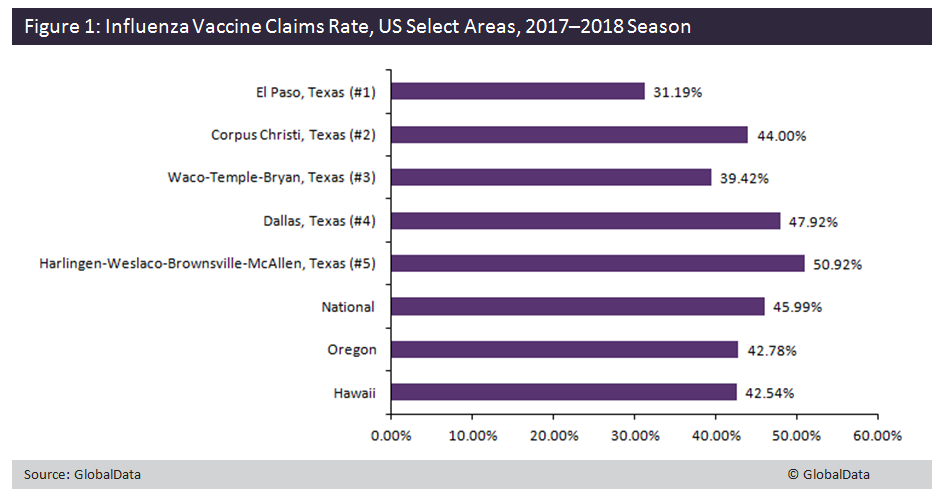 The Walgreen’s Flu Index reported the top 10 US market areas with flu activity, seven of which are in Texas. GlobalData examined the influenza vaccination rates of the top five market areas with flu activity, as well as Oregon and Hawaii, the two states currently with lowest flu transmission levels in the country. Influenza vaccination rates were obtained through the US Department of Human Health Services’ statistical database on vaccination claims among Medicare beneficiaries for these areas in the US.