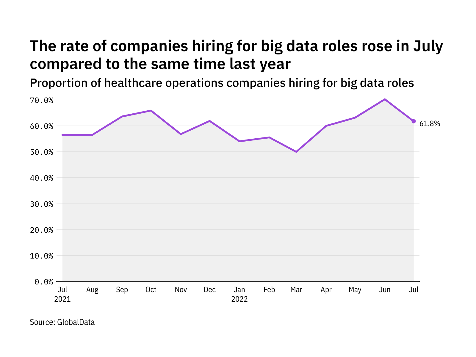 The proportion of healthcare operations companies hiring for big data related positions rose in July 2022 compared with the equivalent month last year, with 61.8% of the companies included in our analysis recruiting for at least one such position.
