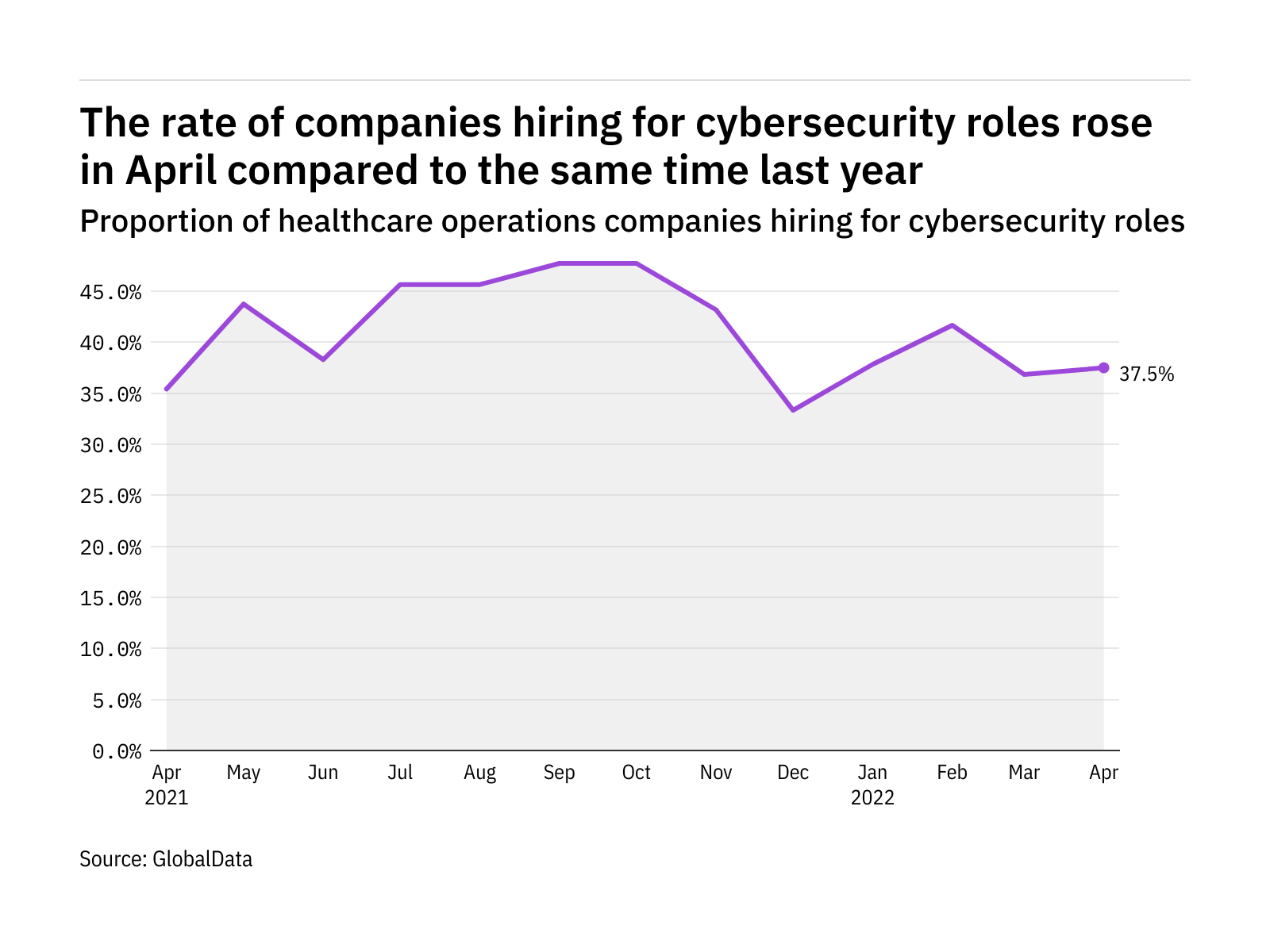 The proportion of healthcare operations companies hiring for cybersecurity related positions rose in April 2022 compared with the equivalent month last year, with 37.5% of the companies included in our analysis recruiting for at least one such position.