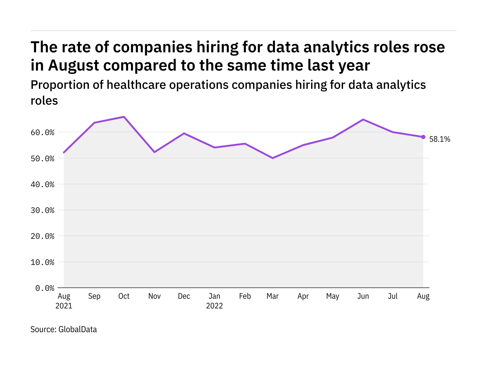The proportion of healthcare operations companies hiring for data analytics related positions rose in August 2022 compared with the equivalent month last year, with 58.1% of the companies included in our analysis recruiting for at least one such position.