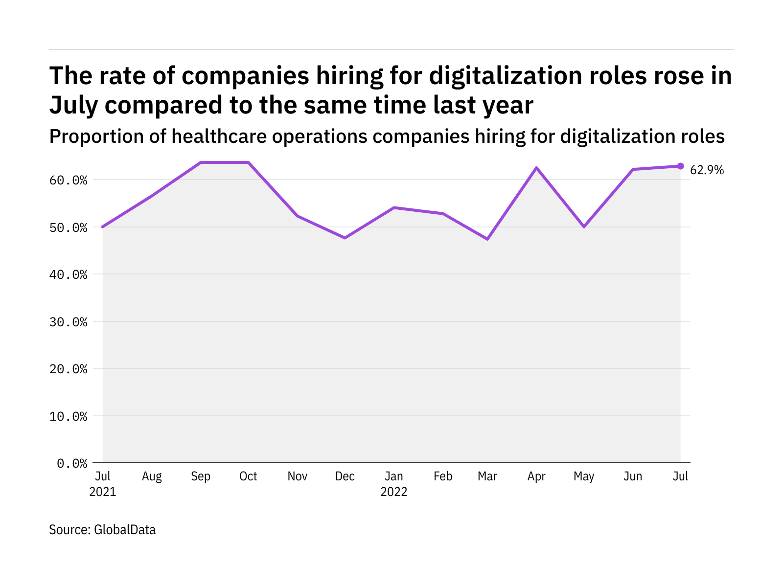 The proportion of healthcare operations companies hiring for digitalization related positions rose significantly in July 2022 compared with the equivalent month last year, with 62.9% of the companies included in our analysis recruiting for at least one such position.