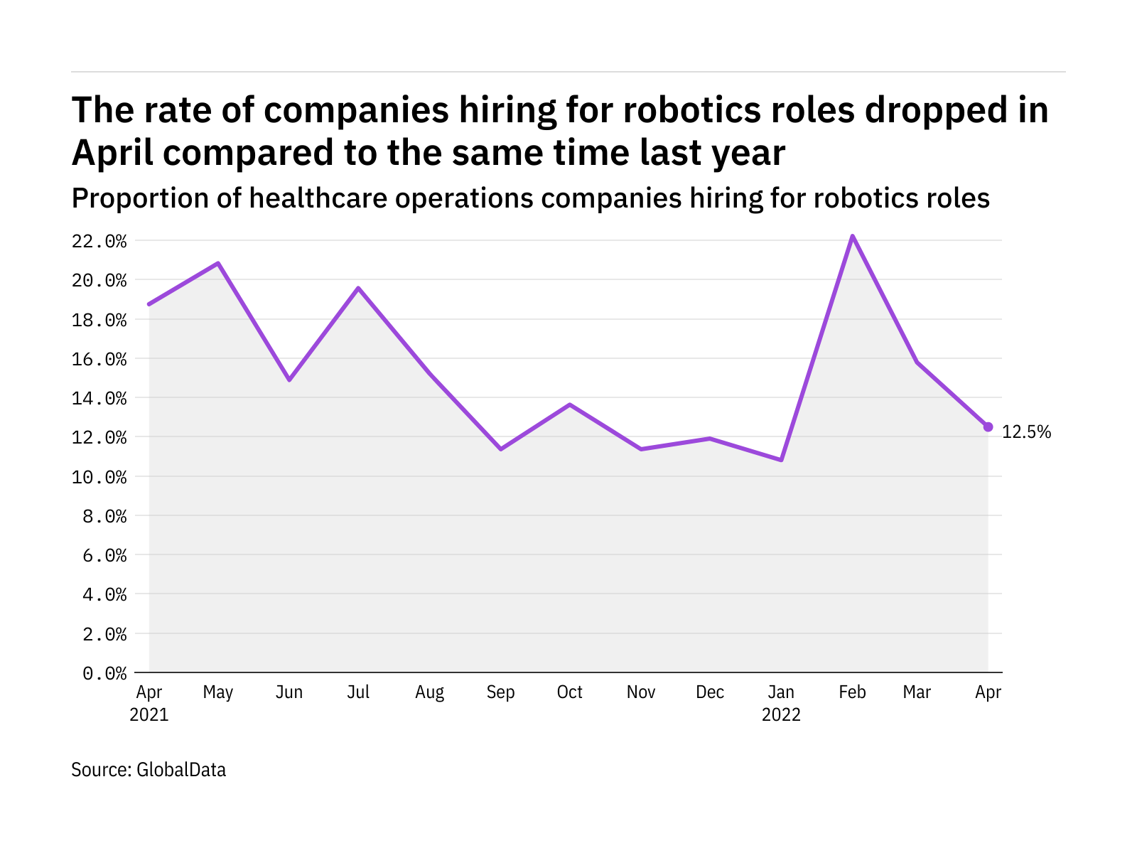 The proportion of healthcare operations companies hiring for robotics related positions dropped in April 2022 compared with the equivalent month last year, with 12.5% of the companies included in our analysis recruiting for at least one such position.