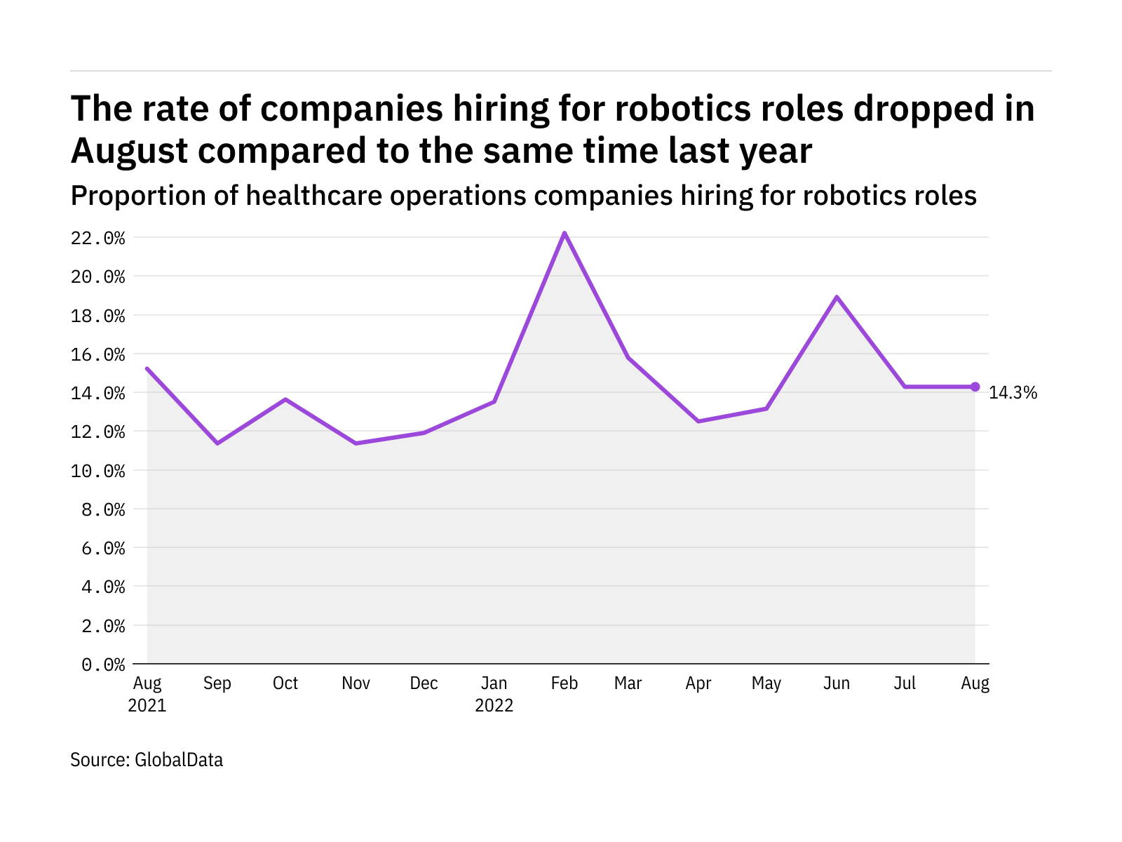 The proportion of healthcare operations companies hiring for robotics related positions kept relatively steady in August 2022 compared with the equivalent month last year, with 14.3% of the companies included in our analysis recruiting for at least one such position.