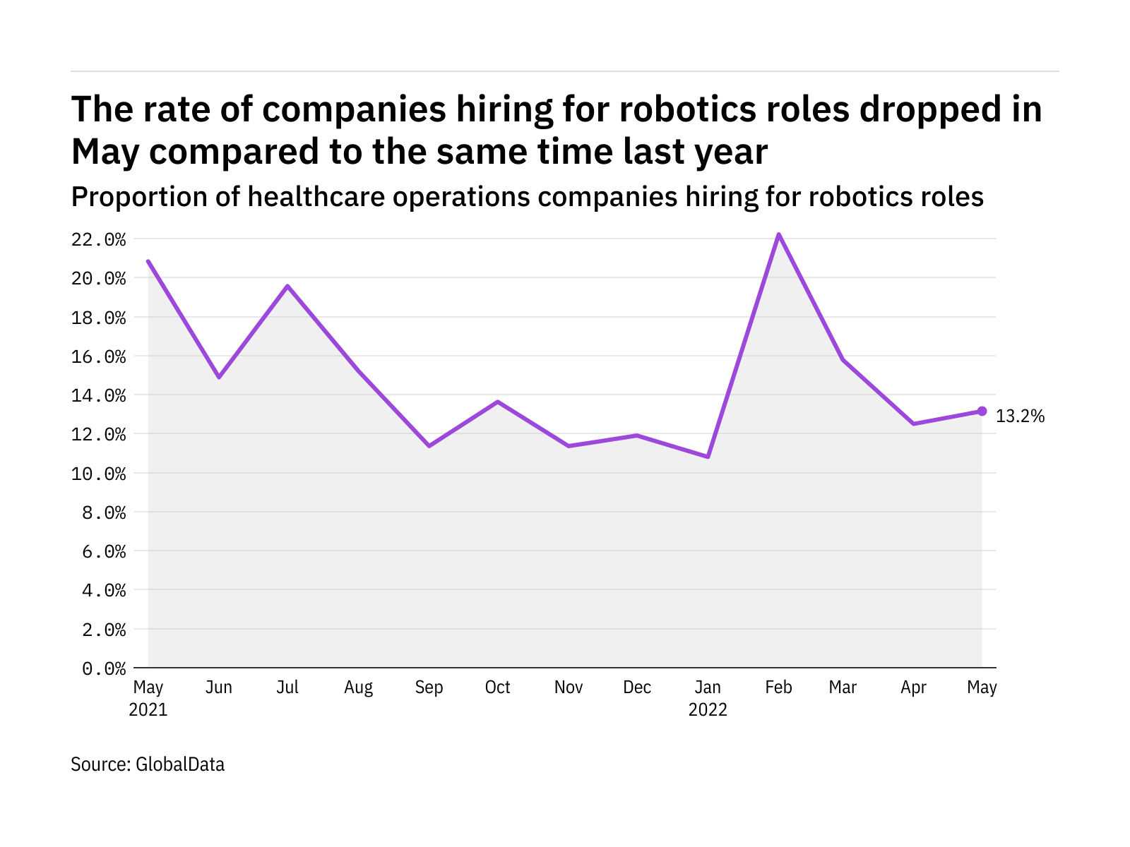 The proportion of healthcare operations companies hiring for robotics related positions dropped in May 2022 compared with the equivalent month last year, with 13.2% of the companies included in our analysis recruiting for at least one such position.