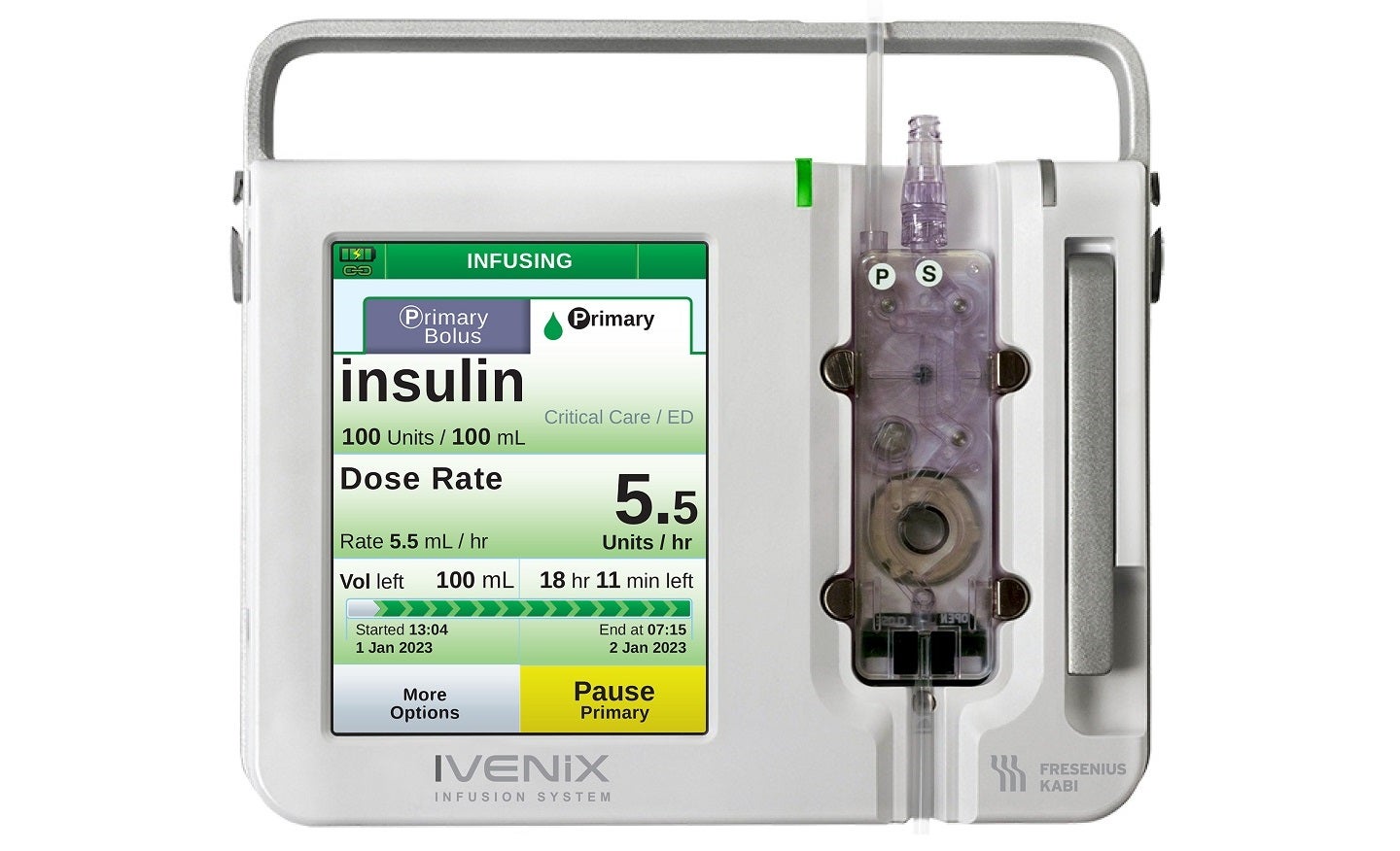 The Ivenix Infusion System from Fresenius Kabi is a smart pump with advanced technology, and features a smartphone-like touchscreen, along with a pumping mechanism.