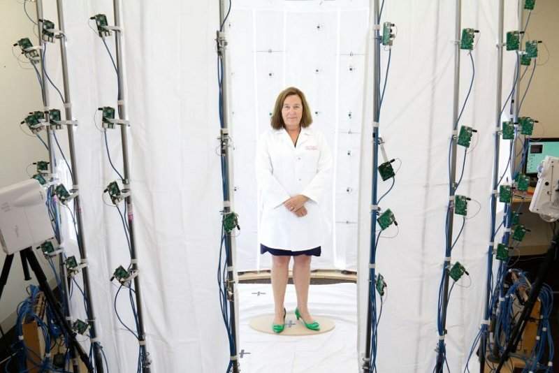 Image: Leslie Saxon stands in the virtual doctor photo tent at the Institute of Creative Technologies. Photo: courtesy of Eddie Sakaki.