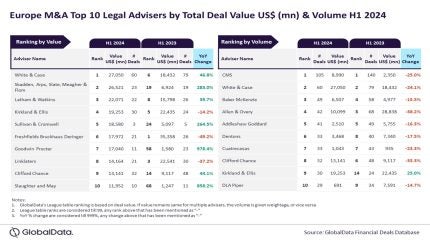 White & Case and CMS have been recognised as the top mergers and acquisitions (M&A) legal advisers in Europe for the first half (H1) of 2024, according to the latest legal advisers league table by GlobalData, a leading data and analytics company.