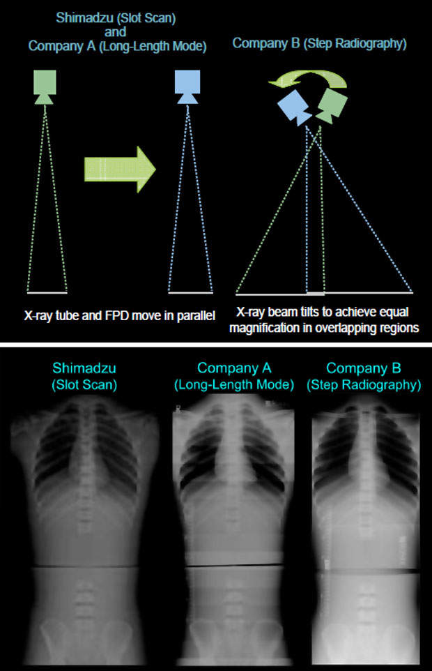 Long-length imaging is possible using FPD fluoroscopy systems from other manufacturers, in addition to the SONIALVISION safire II. The imaging method differs from manufacturer to manufacturer. Company A adopts the same parallel movement of X-ray tube and FPD used by Shimadzu, whereas Company B tilts the X-ray beam such that the magnification is identical in the overlapping regions of the two images (Fig. 2). Before we introduced the SONIALVISION safire II system, we already had instruments that offered long-length imaging functions. However, due to the complexity of setting radiography conditions and the difficulty in understanding the range of coverage, they proved inadequate to substitute for conventional cassette radiography and were not used for routine radiography examinations. However, the SONIALVISION safire II Slot Scan function is easy-to-use and frequently used for routine radiography.