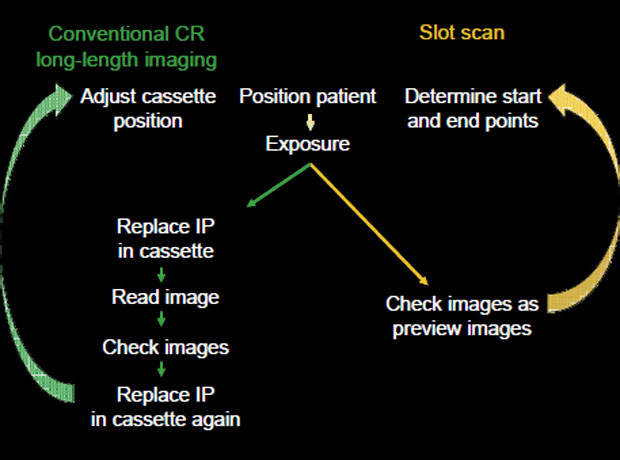 Fig. 3 shows flowcharts of the work flow for cassette radiography and Slot Scan radiography. The conventional CR long-length imaging operation is complex. It requires switching the IP and reading the image after every exposure. Patient throughput is poor, as the patient has to wait in the radiography room while the images are being checked. Conversely, Slot Scan radiography requires just the start and end positions to be set. Images can be checked immediately after radiography is complete, which reduces the examination time and improves efficiency.