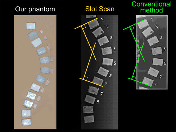 We produced a phantom to evaluate any discrepancy between the Cobb angle measured from the conventional method and from Slot Scan measurements (Fig. 5). The phantom comprised plastic cases filled with caulking that were arranged as simulated vertebrae. Measurements were performed by doctors and technologists. Both the conventional method and Slot Scan produced approximately the same measured results, confirming that no problem arises when using both Slot Scan and the conventional method.