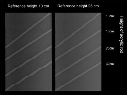 Using Slot Scan, the position of interest is adjusted to the reference height during image reconstruction to ensure accurate measurements. However, appropriate images cannot be obtained if the reference height differs from the area of interest. Fig. 6 shows Slot Scan images of acrylic rods positioned at different heights above the tabletop. The image is reconstructed correctly for the acrylic rod at the reference height. For rods higher than the reference height, the stitched positions are more separated in the reconstructed image. For rods lower than the reference height, the stitched positions are more overlapped in the reconstructed image.