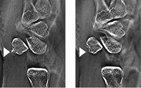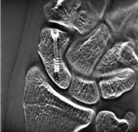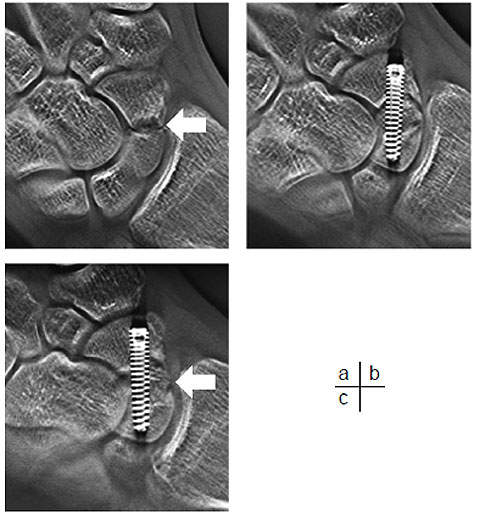 Scaphoid bones with Herbert screw fixation are traditionally evaluated using simple X-ray images and stress radiography, as artifacts make computed tomography (CT) inappropriate for these follow-up observations. As tomosynthesis is reported to be less affected by artifacts than CT¹, we evaluated the possibility of using it for follow-up observations of the scaphoid bone.