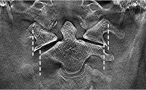 Case 3 – 58-year-old female: a patient who had fallen down stairs at home was immediately hospitalized after CT confirmed a Jefferson fracture. The treatment for a Jefferson fracture is determined according to whether the transverse ligament is intact or broken. This is evaluated from the degree of lateral dislocation of the lateral mass of the atlas with respect to the lateral mass of the axis on both sides³. Frontal tomosynthesis of the cervical vertebrae was performed the day after hospitalization. It provided better evaluation of the lateral mass of the atlas and axis than general radiographs or CT (Fig. 12). Conservative treatment by Halo vest fixation was performed.
