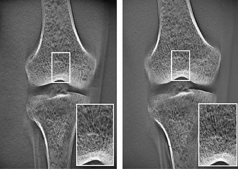 The FPD high-gain mode achieves image quality equivalent to the conventional method using just one-half the radiography conditions. This results in reduced X-ray exposure dose.