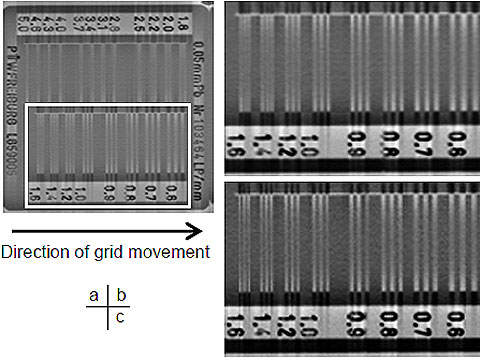 Grid movement control during tomosynthesis eliminates the need for the conventional moire elimination filter. It improves the horizontal resolution that was sacrificed when a moire elimination filter was used (Fig. 15).
