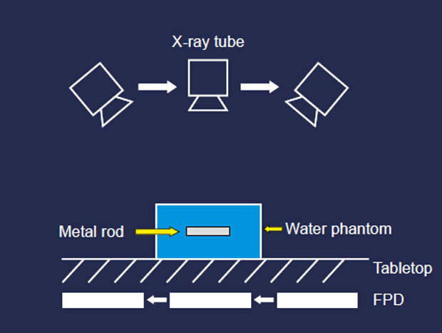 A water phantom containing a 3mm-diameter metal rod representing a screw was positioned on the tabletop with the rod long axis parallel to the tabletop (Fig. 2). Tomosynthesis was conducted with radiography conditions 50kV and 4mAs/pulse, 5s tomography time, and fixed 9in effective field size. FBP image reconstruction was used. The following parameters were changed: