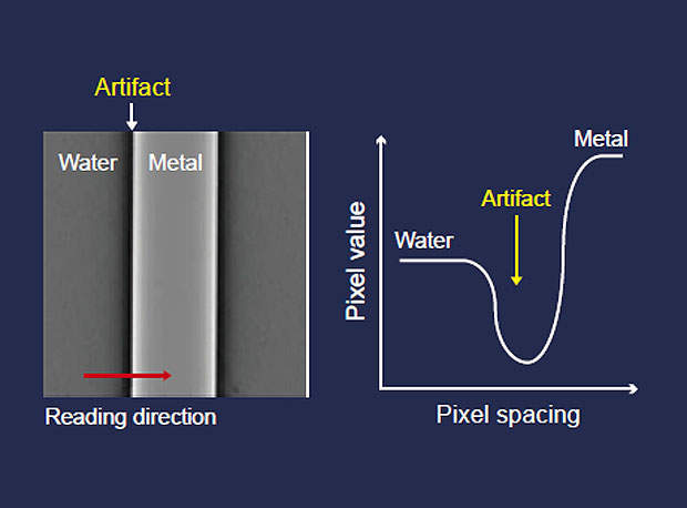 Artifacts were analyzed using Image J image analysis software on DICOM data obtained from radiography. Data was read in a direction perpendicular to the metal rod long axis. It was used to create an artifact profile curve, with the pixel value along the vertical axis and pixel spacing along the horizontal axis (Fig. 4).