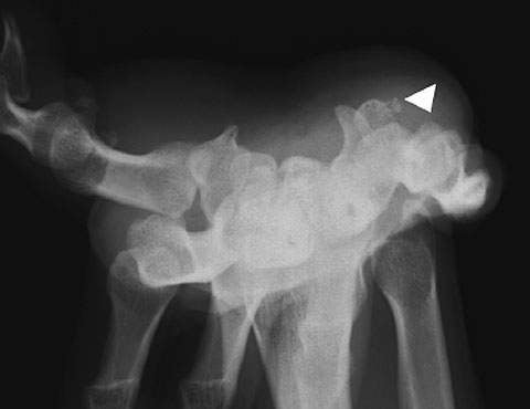 Case 1 – 29-year-old male: the patient visited the hospital complaining of unexplained pain in the right volar wrist during flexing for the past few months. Carpal tunnel radiography confirmed calcification at the ulnar side of the pisiform bone (Fig. 9), although it was not apparent in general radiographs from two directions. Lateral tomosynthesis of the wrist joint revealed a calcified deposit. Another tomosynthesis image taken two months later confirmed repair at the exfoliated area (Fig. 10).