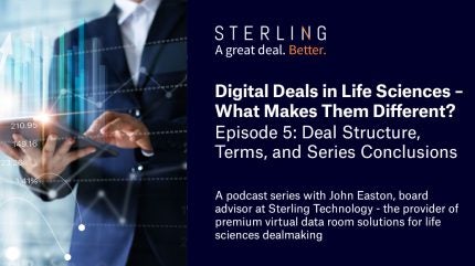 Welcome to the fifth and final episode in our podcast series “Digital Deals in Life Sciences – What Makes Them Different?” Transactions involving digital assets are becoming an increasing focus for pharmaceutical companies. In this series, life sciences industry M&A veteran and Sterling Technology board advisor John Easton discusses how these differ from traditional life science deals, and what both parties should look out for to increase the chances of deal success, mitigate risks, and avoid failure.